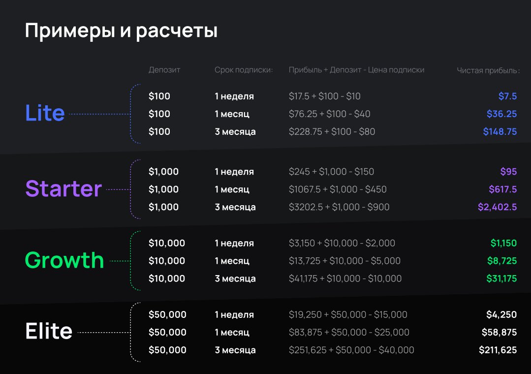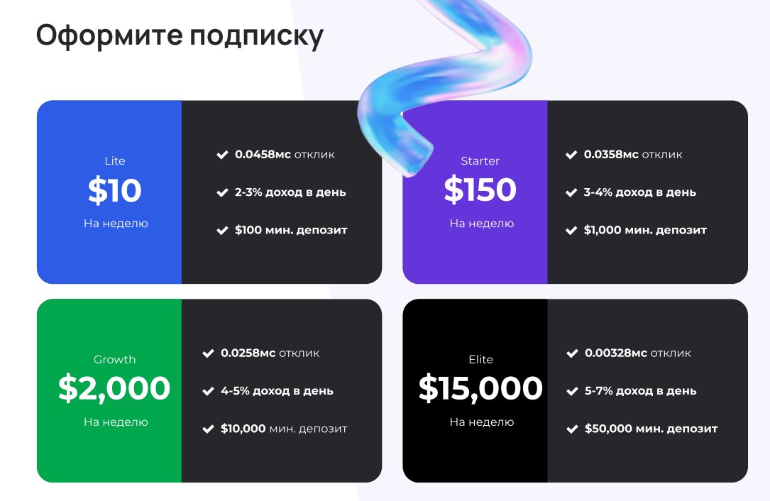 2) Lite: от 3 до 4% в сутки сроком от 1 недели до 3х месяцев, депозит возвращается в конце срока (от 1 000$). Стоимость подписки: 150$ на неделю, 450$ на месяц и 900$ на 3 месяца