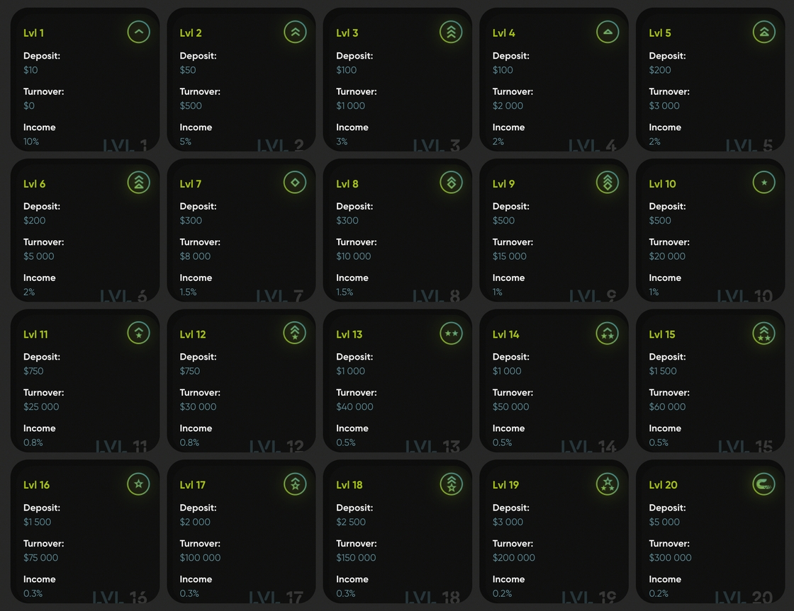РЕФ. ПРОГРАММА: 10% от прибыли рефералов первого уровня (тут без рефбека), также есть уровни в глубину, которые открываются от суммы личного вклада, подробнее:
