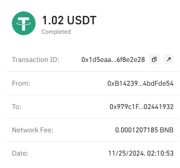 On your wallet 0x325a7D8B2eE032da***** Tether BEP-20 withdrawn 5.2 USDT (batch: ?1337121)