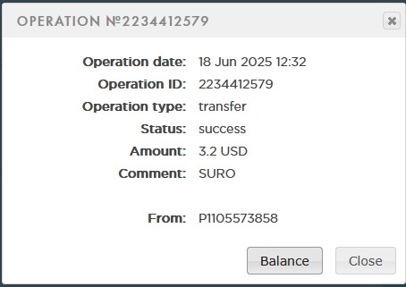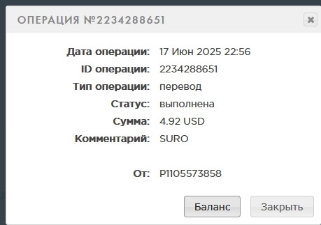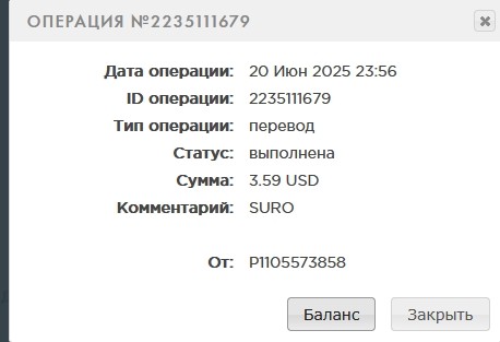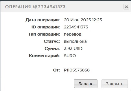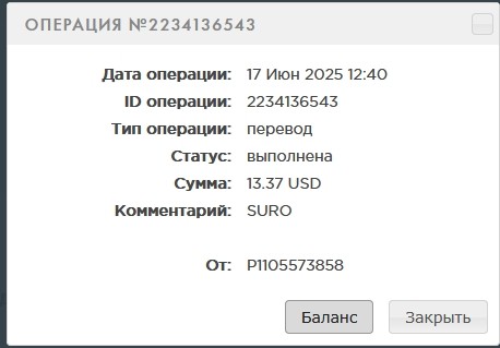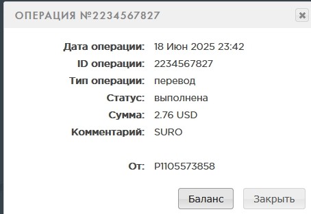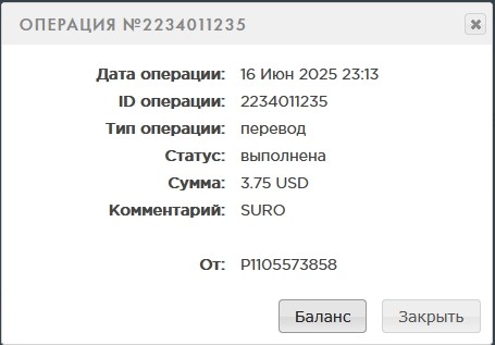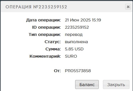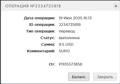 9. Операция №2234816003 Дата операции: 19 Июн 2025 22:04 ID операции: 2234816003 Тип операции: перевод Статус: выполнена Сумма: 0.5 USD Комментарий: SURO