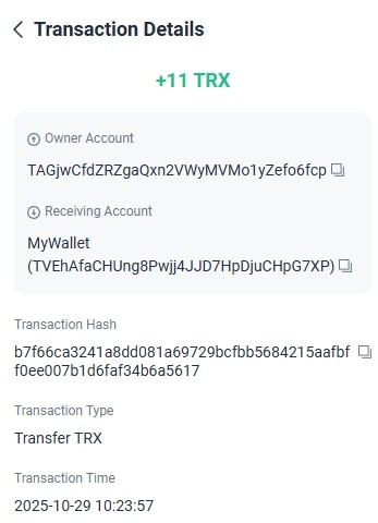 https://tronscan.org/#/transaction/7da661952fc4413672e58c071fd0f95f1cb241681108