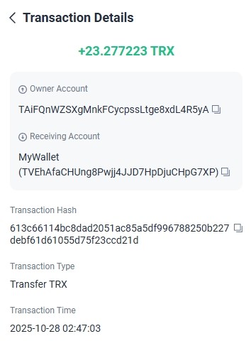 https://tronscan.org/#/transaction/616ee8ff024479a71993e4ea3f25b84bc6eaedf0922b