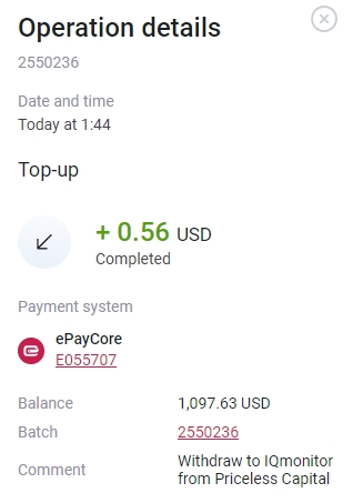 2. Instant-monitor.com: Operation ID: 2552841 Operation Date: 02.09.2024 05:32 Status: Completed Sender's account: ePayCore E055707 Amount: 0.75 USD Note: Withdraw to InstantMonitorCom from Priceless Capital