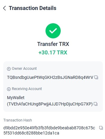 https://tronscan.org/#/transaction/2086fa8af8112e03f125521fabc05c6621b2dae359f5