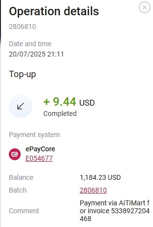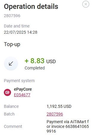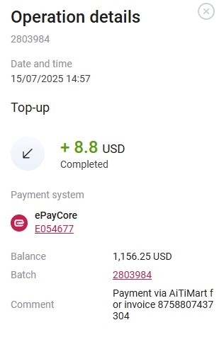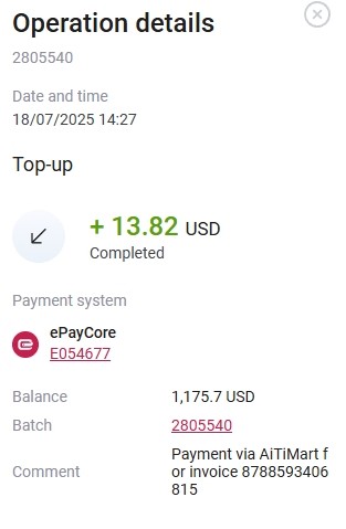 Примечание: Payment via AiTiMart for invoice 8936768887